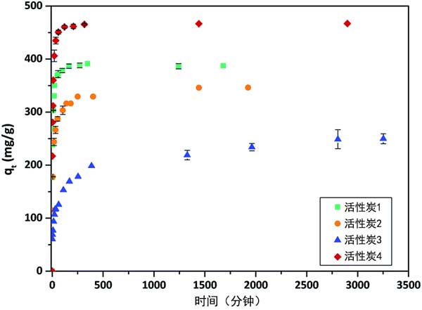 圖2:活性炭在25°C時異丙甲草胺的吸附量隨接觸時間的變化。
