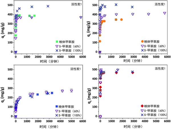 圖3:活性炭在25°C時映體,S-甲草胺(60%)和S-甲草胺(100%)吸附的演變。