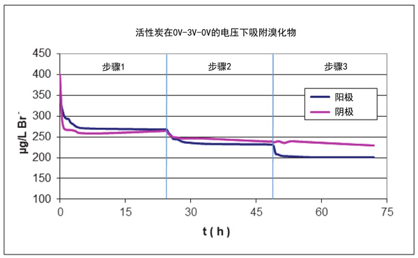 圖4:在三步實(shí)驗(yàn)中的溴化物濃度,第二步對(duì)應(yīng)于在3V下進(jìn)行24h的陽(yáng)極和陰極電吸附實(shí)驗(yàn)。在第二步中施加3V電壓24h,然后將其再次置于開(kāi)路狀態(tài)24h。