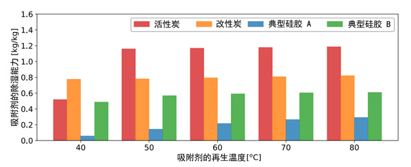 活性炭的除濕能力可以定義為在給定溫度和濕度條件下的有效吸附量,其計算方式為吸附與解吸之間的平衡吸附之差?紤]到實際環(huán)境條件,相當于室外空氣條件的吸附條件為干球溫度為32℃,相對濕度為80%。解吸條件是由再生空氣溫度從40℃到80℃給出的,室外空氣條件下的濕度比為24g/kg。計算出的除濕能力如圖1所示。比較了活性炭和典型硅膠(A型和B型硅膠)在不同再生溫度下的除濕能力。在硅膠的情況下,由于缺乏數(shù)據(jù),吸附和解吸之間的磁滯被忽略了,并且預期它很小。