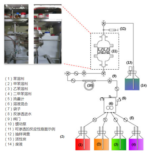 圖1:多孔瀝青路面和可滲透反應(yīng)性路面-活性炭改性瀝青吸附的實驗裝置。