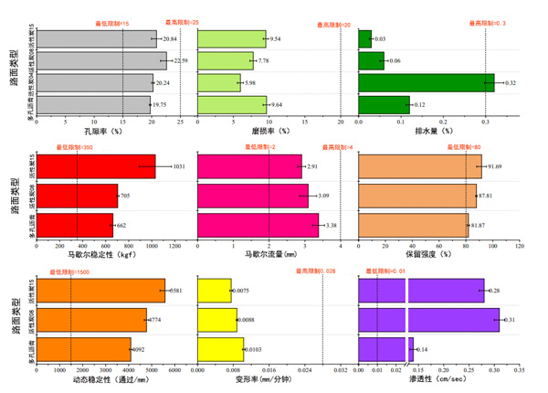 圖2:活性炭和多孔瀝青的調(diào)節(jié)性能(空隙,磨耗,排水,馬歇爾穩(wěn)定性,馬歇爾流量,保留強度,動態(tài)穩(wěn)定性,變形率和滲透性)的比較。