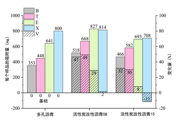 圖3:BTEX吸附在活性炭改性瀝青和多孔瀝青上的質(zhì)量,并以多孔瀝青為基礎(chǔ)比較吸附變化。